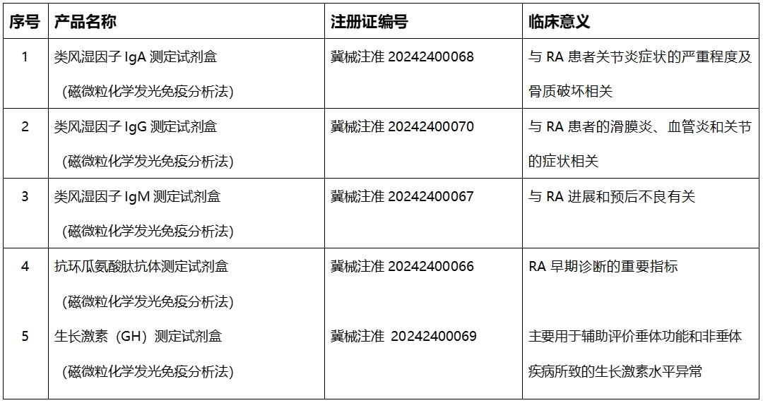 近日,熱景生物新取得由河北省藥品監(jiān)督管理局頒發(fā)的醫(yī)療器械注冊證,分別是類風濕因子分型(RF-IgA、RF-IgG、RF-IgM)、CCP抗體、生長激素(GH)、胰島素樣生長因子結合蛋白-3(IGFBP-3),見下表: