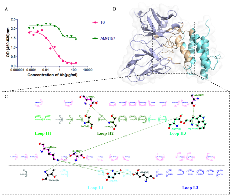 圖1:TSLP-T6復合物結構分析。(A) ELISA實驗測定AMG157與T6抗體的結合表位;(B) TSLP-T6復合物結構;(C) TSLP-T6作用力分析