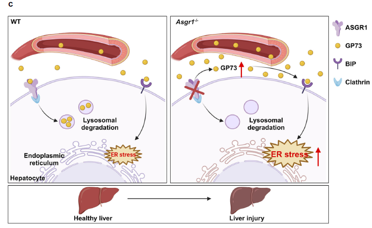 肝臟損傷是多數肝臟疾病的核心病理過程,然而其發(fā)生與進展中的遺傳易感因素仍未充分揭示。本研究發(fā)現,唾液酸糖蛋白受體1(ASGR1)在肝纖維化或肝硬化患者及遭受肝損傷的雄性小鼠中表達下調。ASGR1缺陷會加重乙酰氨基酚誘導的急性肝損傷和CCI4誘導的慢性肝損傷,而其過表達則能減輕這些損傷。機制上,ASGR1與內質網應激介質GP73結合,促進其溶酶體降解。ASGR1耗竭導致循環(huán)中GP73水平升高,并促進GP73與BIP相互作用,激活內質網應激,進而引發(fā)肝損傷。中和GP73不僅能緩解ASGR1缺陷引起的肝臟損傷,還能提高接受致死劑量乙酰氨基酚的小鼠存活率。研究結果表明 ASGR1 缺陷會加劇肝損傷,ASGR1-GP73 軸成為肝損傷的潛在治療靶點。