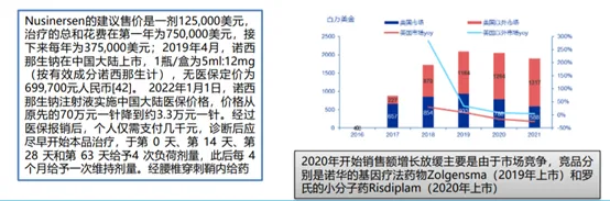 Nusinersen(諾西那生鈉):2016年首次上市,由Ionis研發,是一種反義寡核苷酸(ASO),諾西那生鈉注射液可以改變SMN2前mRNA的剪接,從而增加完整長度SMN蛋白的產生。2019年中國獲批上市,且于2021年納入國家醫保目錄。諾西那生鈉可用于出生3天的嬰兒到80歲的老人,適用人群非常廣泛。截止到2021年,全球有11000人使用過諾西那生鈉。