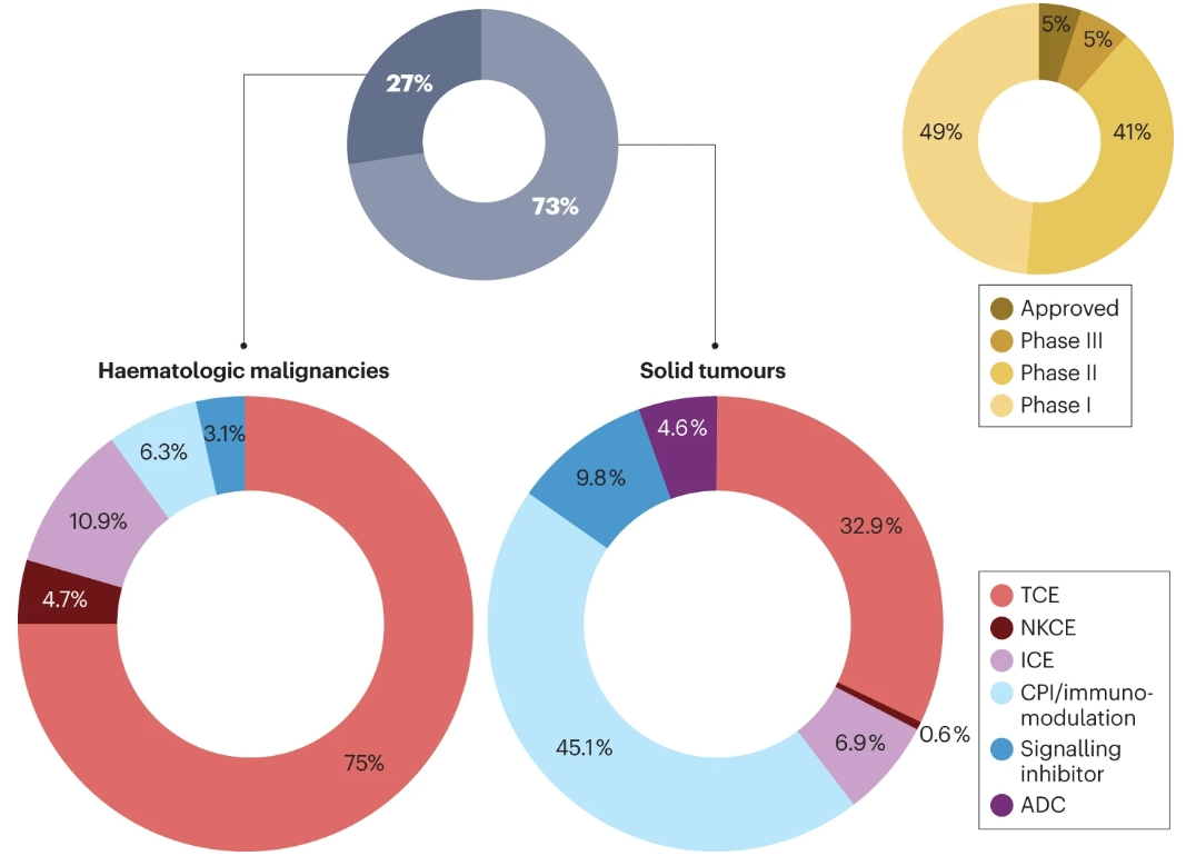 目前,有300多項臨床試驗涉及200多種不同的雙特異性抗體分子,其中約75%用于治療實體瘤,25%用于治療血液系統惡性腫瘤。有10種bsAb藥物已被批準用于癌癥治療,其中9種在美國和/或歐洲獲得批準,cadonilimab在中國獲得批準。到目前為止,臨床中開發的很大一部分bsAbs已經處于后期階段(II期和III期)。另外,可以發現,治療實體瘤的bsAbs主要由免疫調節劑主導,包括雙CPI(約45%)和TCE(約33%),其次是靶向雙途徑、ICEs和ADC的bsAb。
