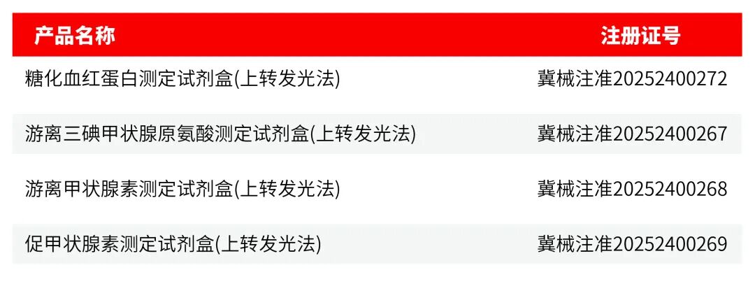 近日,熱景生物基于上轉發光(UPT)技術的 4 項醫療器械產品,成功拿下國家藥監局《醫療器械注冊證》!此次獲批的甲功三項(FT3、FT4、TSH)與糖化血紅蛋白檢測項目,不僅是公司技術實力的權威認證,更將為臨床診療與慢性病管理帶來便捷新選擇。